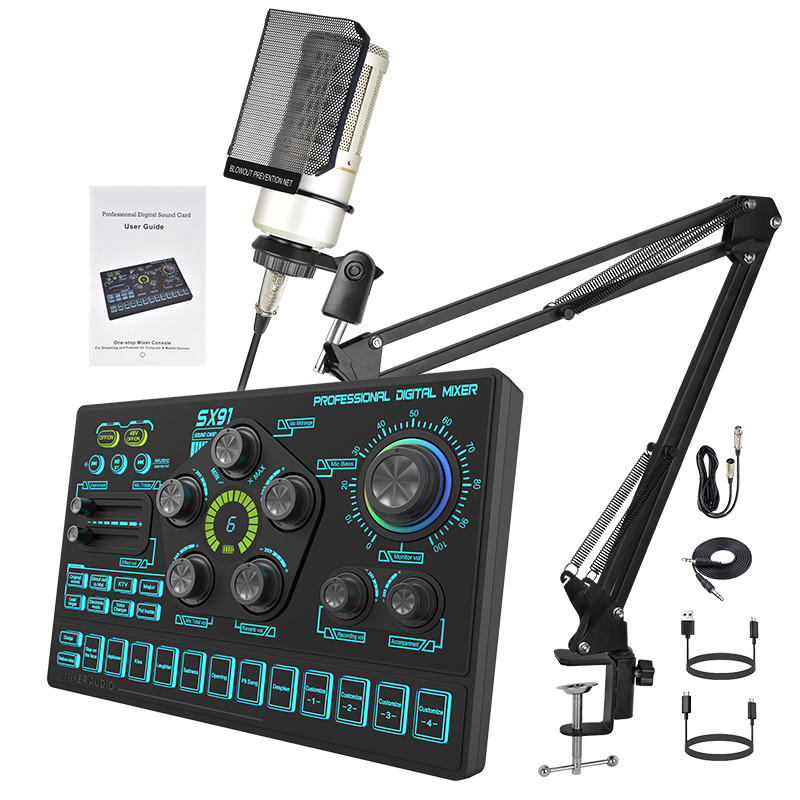Настройка настольного подкаста XLR с аудиокартой и микрофонами для студийной записи ПК и записи компьютерного микрофона